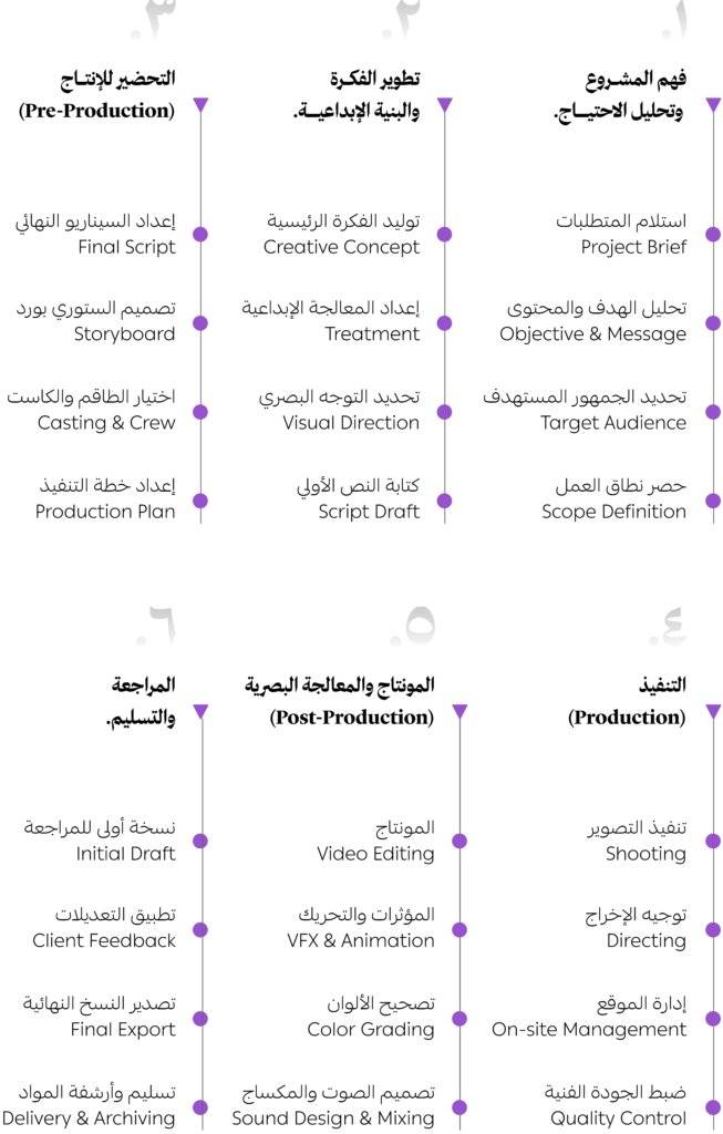 نعمل وفق منهجية واضحة تجمع بين الإبداع والتنظيم، ونلتزم بأعلى المعايير الفنية لضمان جودة التنفيذ وسلامة الرسالة.